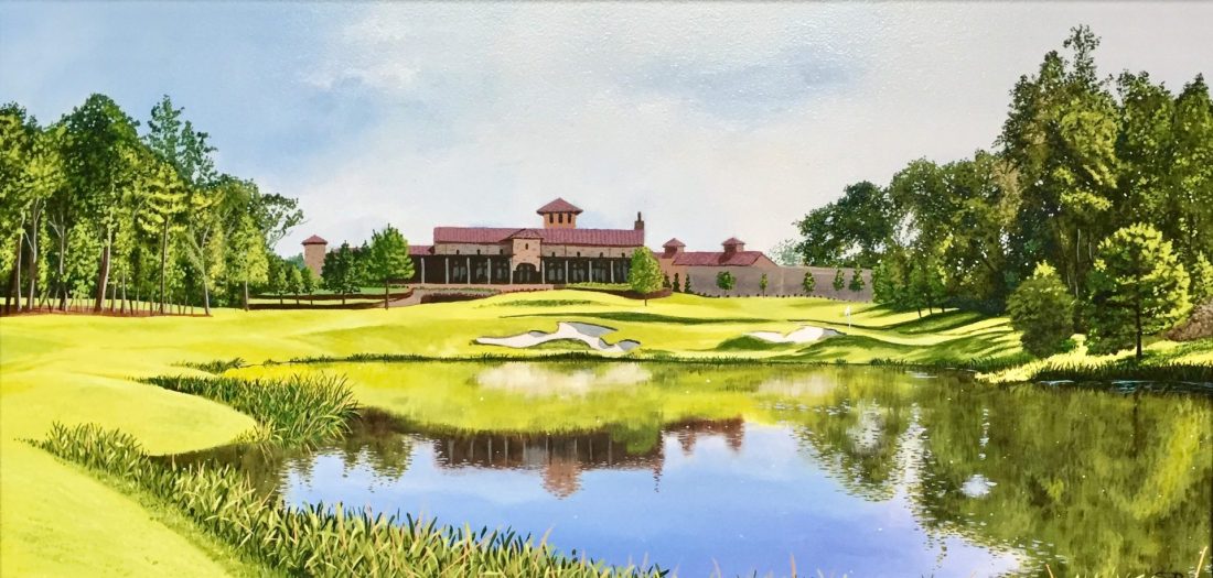 Description: This 10”x20” acrylic painting represents the Nicklaus Country Club at Carlton Woods located in The Woodlands, TX. It’s known as one of the most prestigious golf courses.