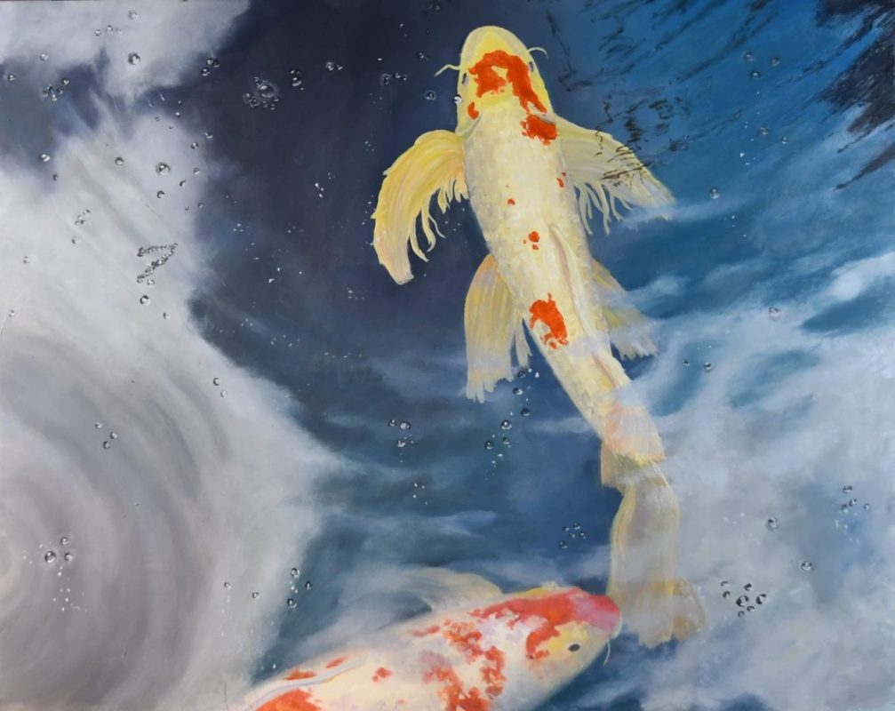 Description: 18x18 inch oil on board. The Koi contrast with the dreaminess of the swirling cloud reflections