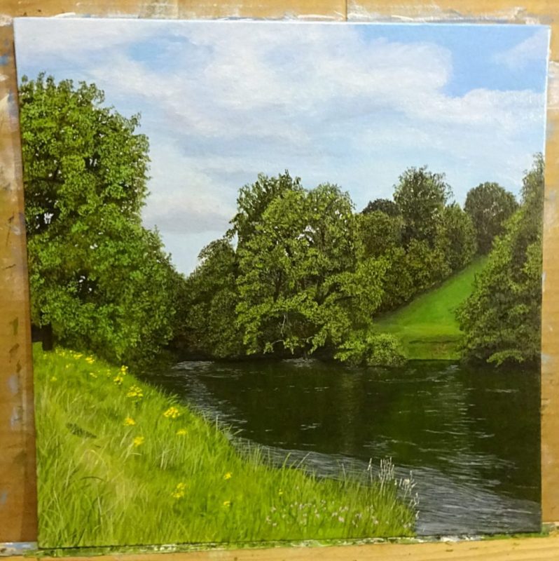 Description: Oil on canvas board 12x12” (Flipped the reference material and cropped out part of the bank to concentrate more on the water and trees.) A summer river flows onward indifferently as the grass and trees wait expectantly for a cooling rain shower. The riverbank beckons a passerby to sit on her lap and find rest.