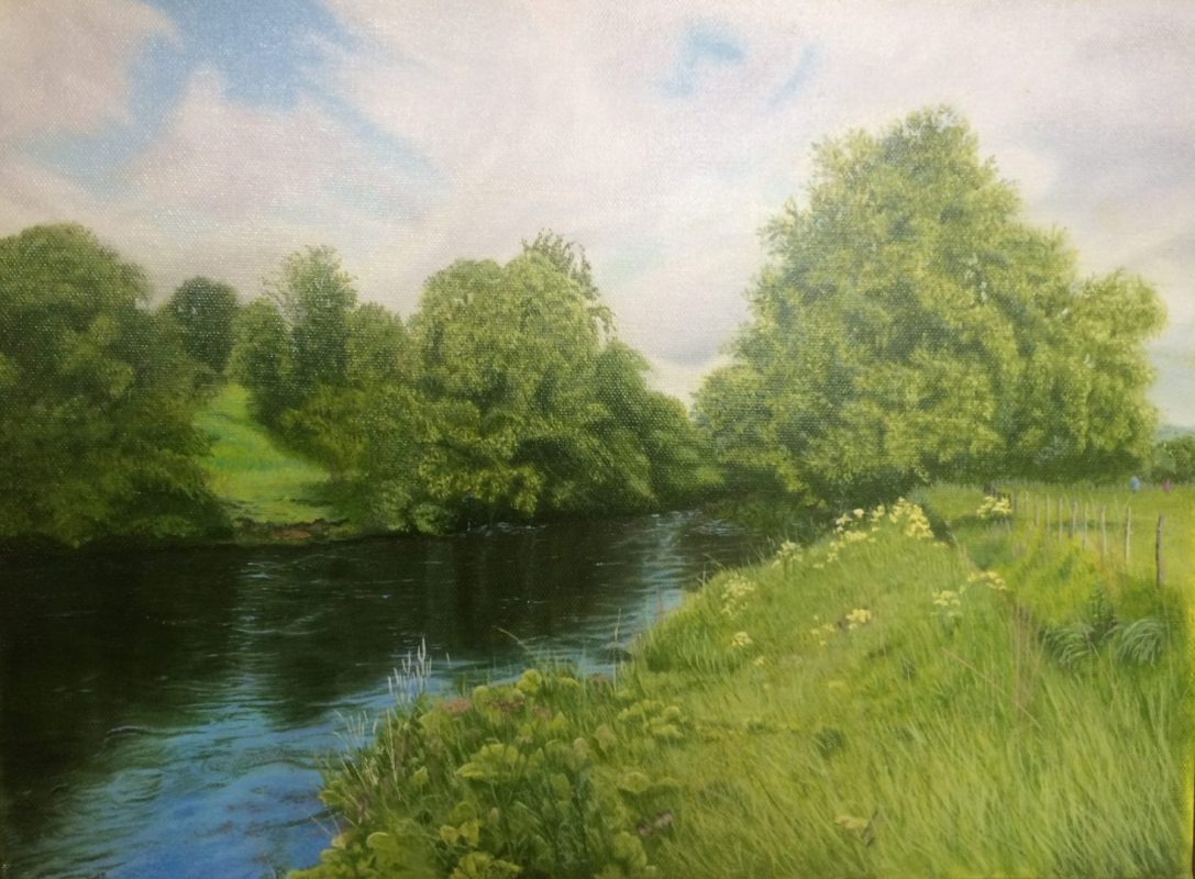 Description: This scene of a river bank lined with trees and wild plants is painted in oils. I call it Sweet Spot because it's a perfect place to kick back, relax, enjoy a little sun and listen to the river.